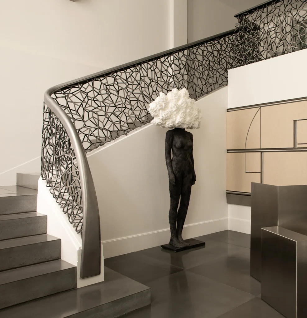 On the lower level, the residence includes a private wellness area with sauna and hammam. A sculptural staircase designed by Karl Lagerfeld together with industrial designer Marc Newson connects the different levels of the residence.